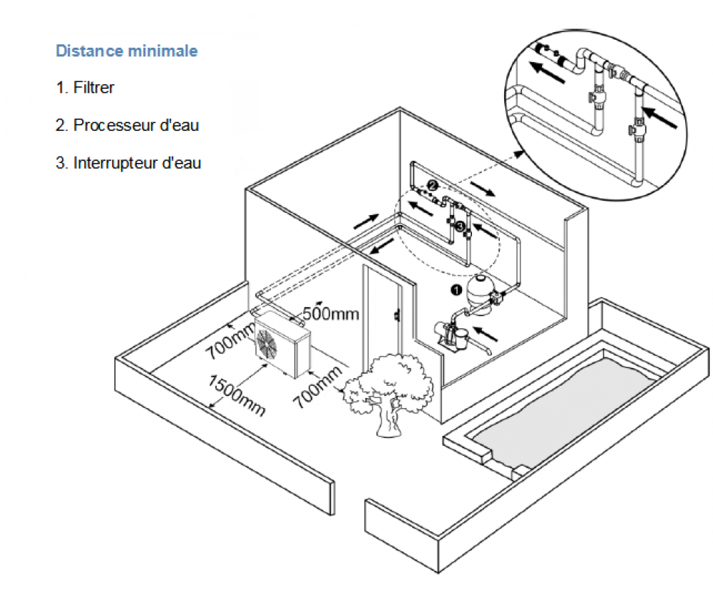 Pour le raccordement au circuit de filtration, la pompe à chaleur est fournie avec des raccords pour le collage d`un tuyau PVC de 50 mm. Il est impératif de raccorder la pompe à chaleur à un système de dérivation, par exemple un système à trois vannes, afin de pouvoir réguler le débit d`eau. Un débit plus faible permet un meilleur transfert de chaleur à l`eau de la piscine.